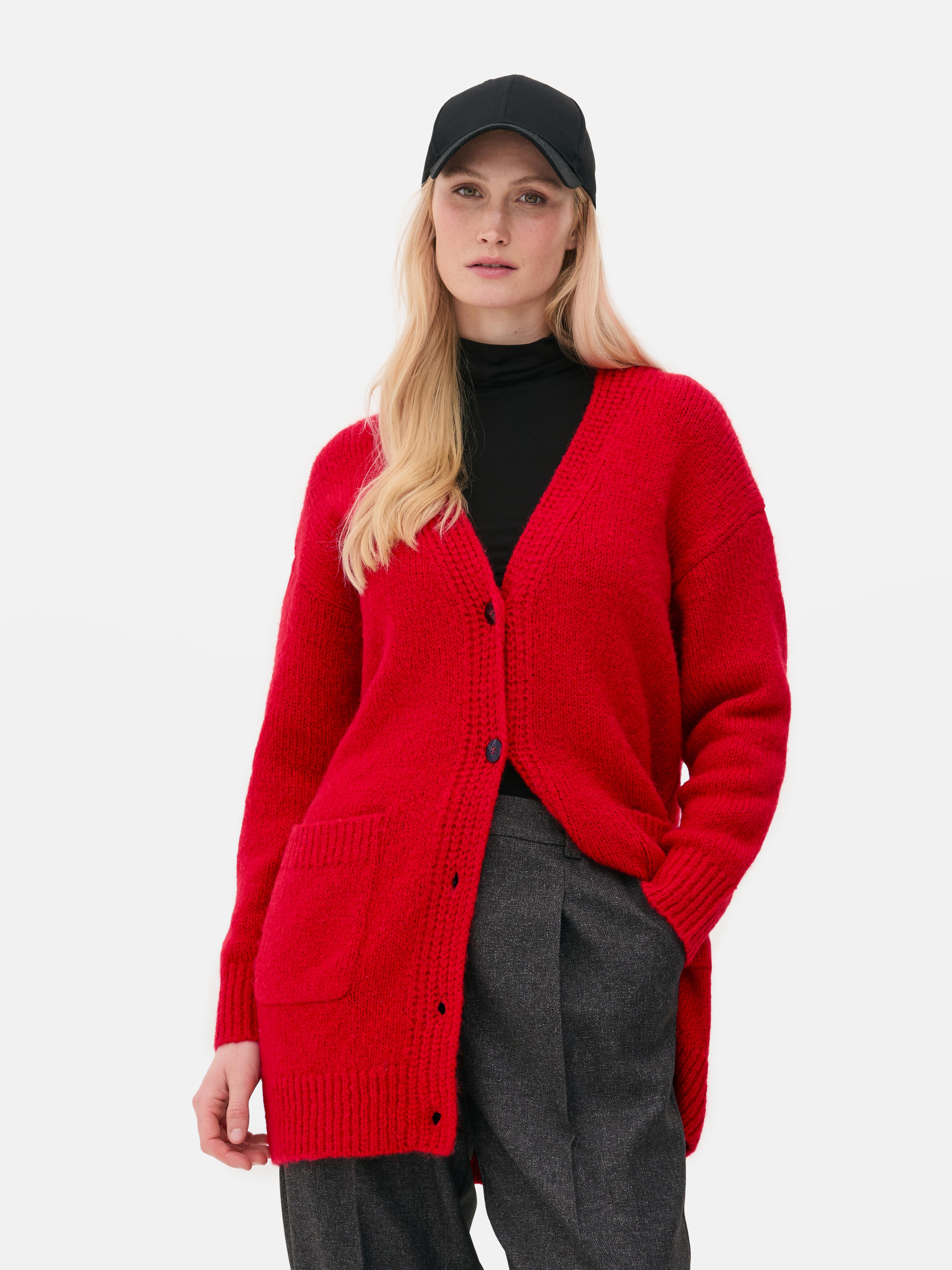 A long cardigan with an oversized fit, V-neck and patch pockets