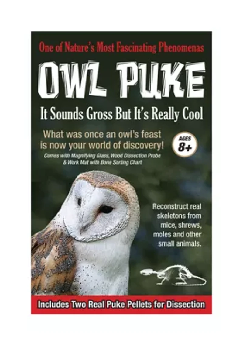 What was once an owl's feast is now your world of discovery! Owl pellets are masses of bones, teeth, hair, feathers, scales, and insect skeletons. They are produced and regurgitated, not only by owls, but also by hawks, eagles, and other raptors which swallow their prey whole or in large pieces. The soft parts of the prey are dissolved by proteolytic enzymes and strong acids which occur in high concentrations in the stomachs of raptors. The relatively weak stomach muscles of the bird form the undigested fur, bones, feathers, etc. into wet slimy pellets. In this process, even the most fragile bones are usually preserved unbroken. Because the pyloric opening of the stomach into the intestines narrows, only finely divided materials pass into the intestine. As a result, tiny bones only occasionally pass through the digestive system. Each whole owl pellet usually contains virtually complete skeletons of the animals which the owl ate the night before the pellet was formed. This kit contains pellets from the barn owl, Tyto alba. These owls feed early in the evening, and then regurgitate a single pellet 18-20 hours after feeding. If the owls roost in unprotected areas, the pellets fall to the ground and decompose quickly. However, if the owls roost in barns, steeples, or caves, the pellets will accumulate in large numbers on the protected floors. Recommended for 1 player, ages 8 and up. Made in USA. Package dimensions: 8.625 x 4.875 x 2.000 inches. Includes 2 Heat Sterilized Puke Pellets, Magnifying Glass, Wood Dissection Probe, Work Mat with Bone Sorting Chart. Wipe clean with dry or damp cloth. Imported Material & Care Plastic Spot clean only