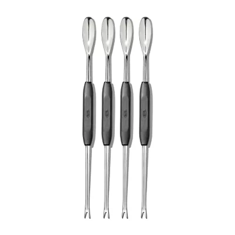 The oxo good grips seafood picks are shaped to get meat out of legs or claws. With a curved spoon head and long neck, the picks reach deep inside shells. The opposite side has sharp fork tines for grabbing large pieces of meat. Featuring a soft, comfortable grip, these picks are non-slip even in wet hands. Also great for getting olives and pickles out of jars.� Set of 4