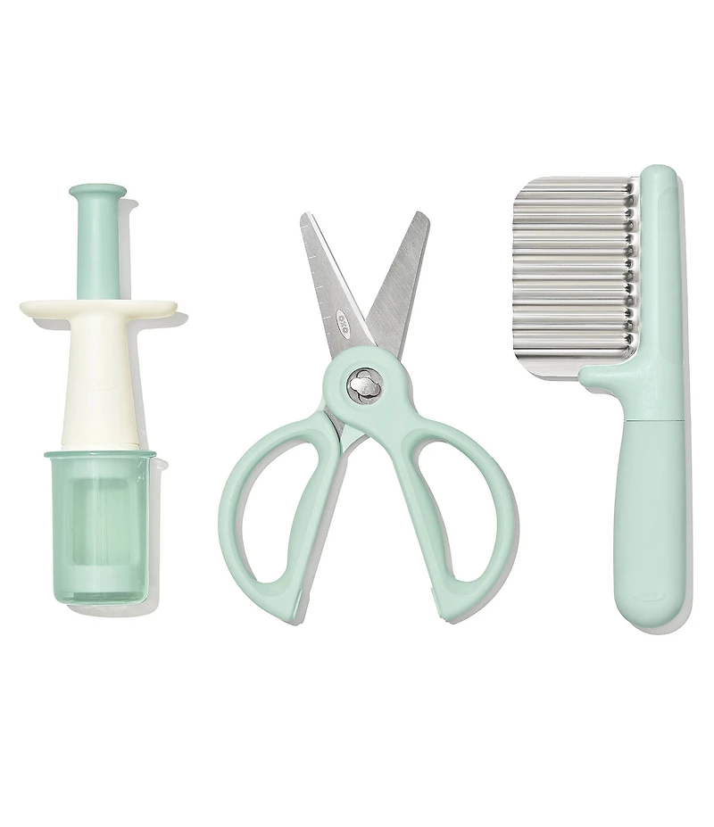 From OXO, this three-piece set features: Baby feeding essentials and travel utensils in a compact baby solid starter kit, designed specifically to support baby-led weaning Three core pieces: the Best-Selling Grape Cutter, Crinkle Cutter (also referred to as Crinkle Food Cutter), and Baby Food Scissors All OXO baby safety food cutter tools include multiple fruit slicer and vegetable chopper options for a well-stocked toddler kitchen Multiple baby eating essentials options allow for the food chopper personalization that stimulates your little one as they practice new self-feeding skills Designed for easy use at home and with travel, OXO's baby utensils are carefully designed as a vegetable cutter or fruit slicer The Crinkle Cutter and Baby Food Scissors create interesting textures and shapes for playful self-feeding The Baby Food Scissors are compact and easy-to-use fruit and vegetable cutters for kids The Grape Cutter transforms your little one's favorite tiny round fruit and chops it into manageable portions, just right for them Stainless steel/silicone Dishwasher safe Imported.
