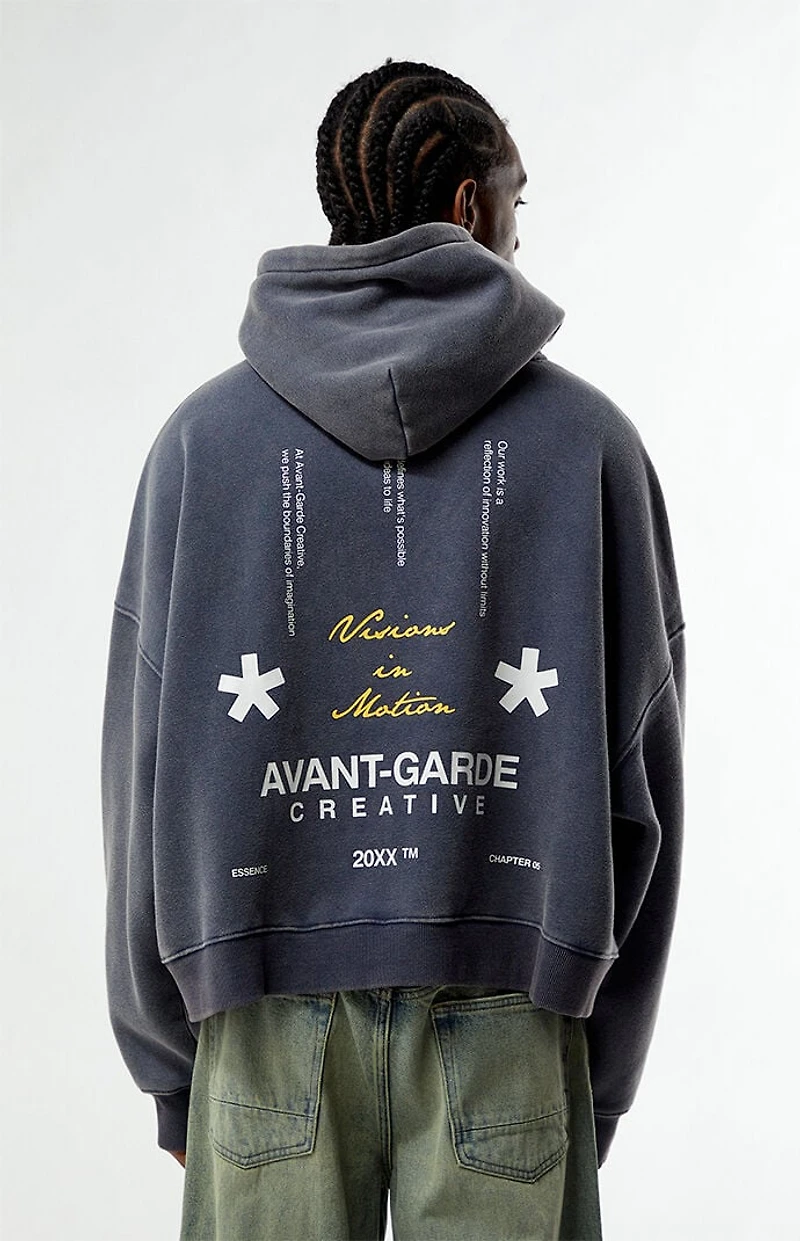 The Pacsun Avant Garde Cropped Hoodie blends bold creativity with a worn-in edge. Made from vintage wash fabric, it features an attached hood, long sleeves with dropped shoulders, Avant Garde Creative graphics on the front and back, a kangaroo pocket, ribbed cuffs and hem, and a cropped fit.