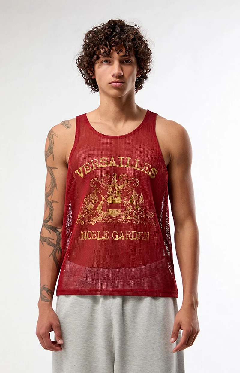 The Versailles Mesh Basketball Jersey Tank Top from Pacsun brings sporty energy to your everyday rotation with a bold graphic and classic jersey feel. Made from breathable mesh fabric, it features a scoop neckline, wide fixed straps, a Versailles Noble Garden front graphic, and a relaxed fit for easy, all-day comfort.