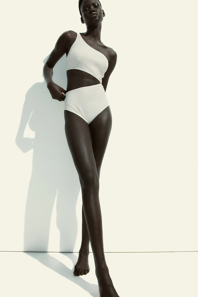 Fully lined, one-shoulder swimsuit. Double shoulder strap on one side, asymmetric neckline, and cups with removable inserts for shaping and good support. Cutout section at waist, high-cut legs, and medium coverage at back.