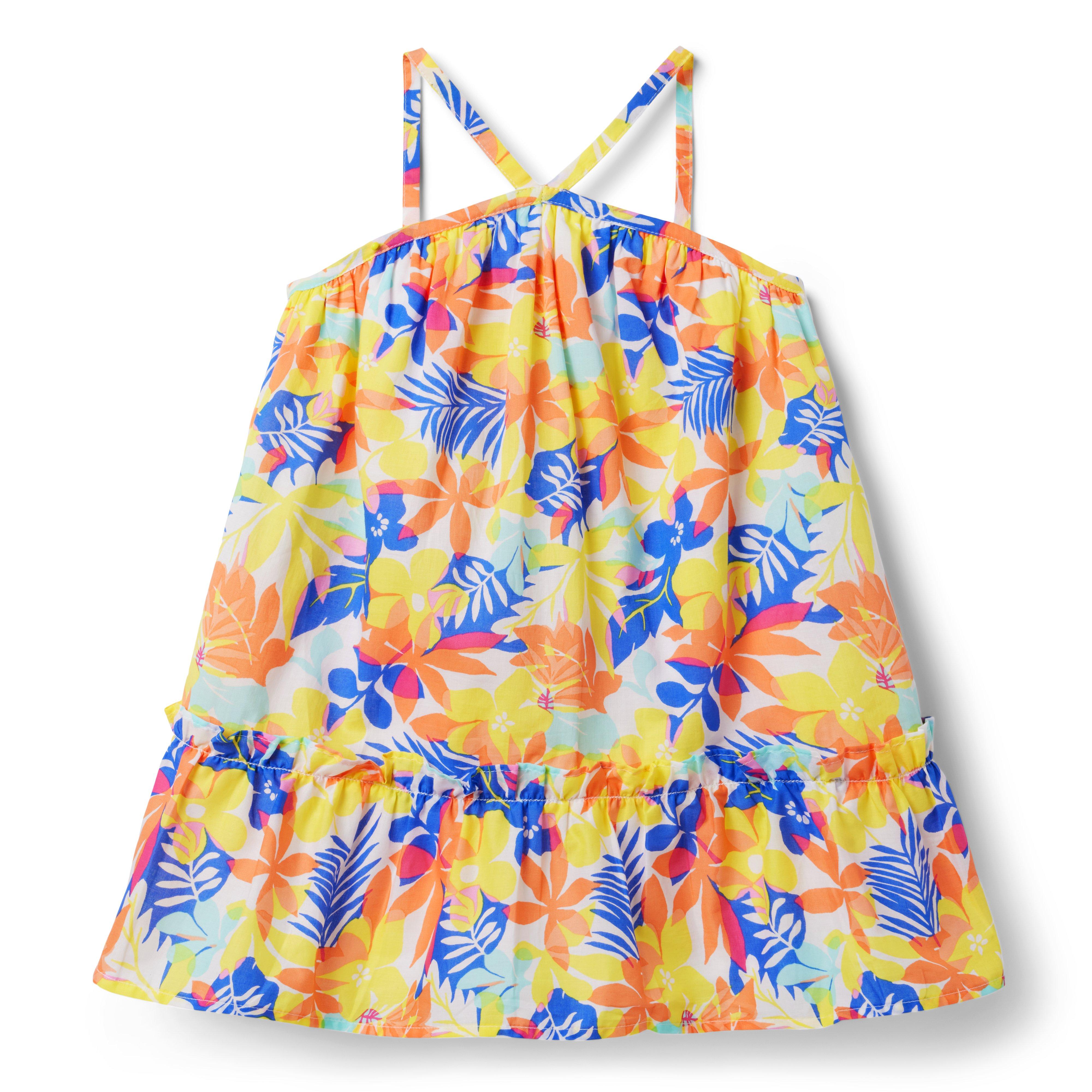 A breezy tropical dress perfect for sunny days. Made in pure cotton with a bright palm floral, ruffle hem and halter silhouette for effortless style. 100% Cotton Batiste Fully Lined Sleeveless Above The Knee Length Matching Family Styles Available Bloomer Included (Sizes Up To 18-24M) Machine Washable; Imported