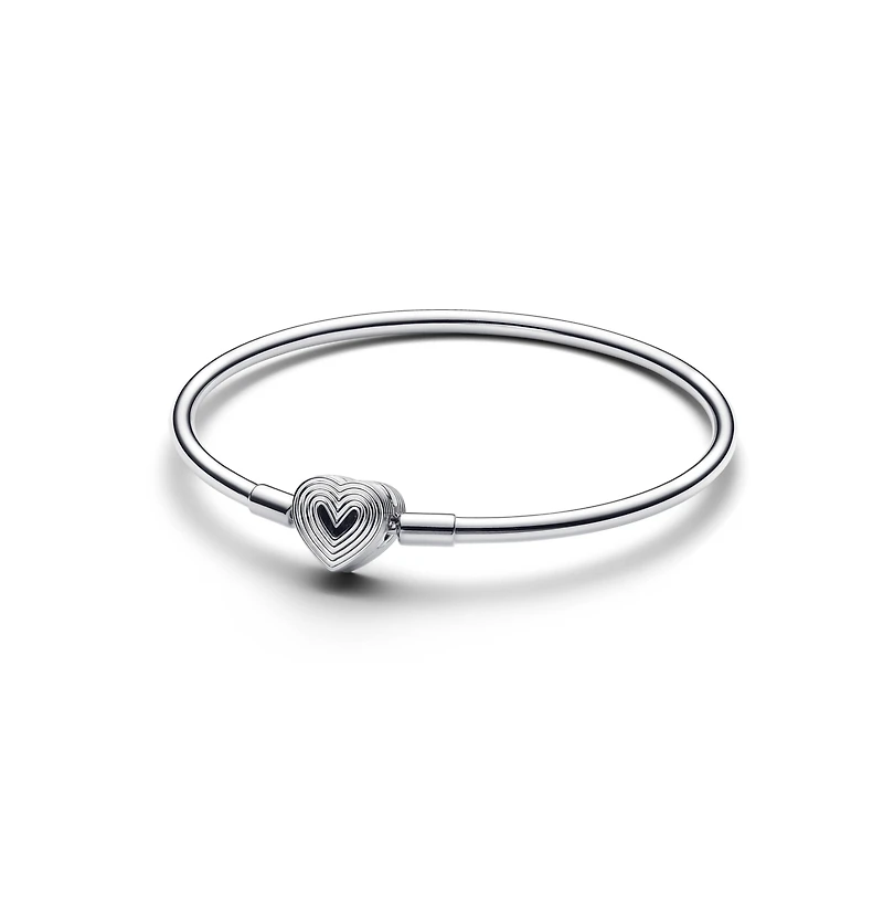 Go for sleek simplicity with the Radiating Heart Clasp Bangle. This sterling silver bangle has a heart-shaped clasp with a cut-out heart on one side –a design that pays tribute to the power of love. Made to be styled with a maximum of 16 to 18 charms or dangle charms, this bangle will become a staple in any collection.
