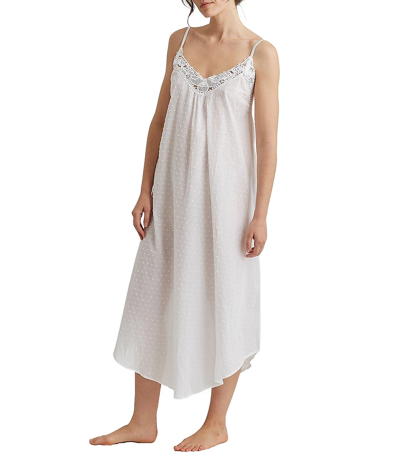 From Papinelle, this nightgown features: Lightweight swiss dot fabrication Lace v-neckline Sleeveless Adjustable straps A-line Scoop hem line Cotton Machine wash cold/line dry Imported.