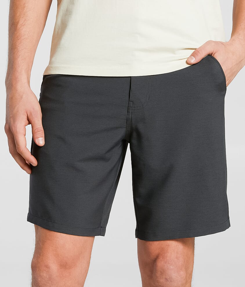Flat front short 12" rise Back welt zipper and snap pockets Zip fly Quick dry