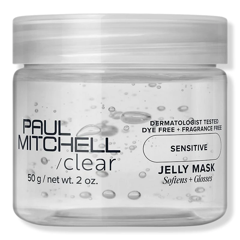CLEAR JELLY MASK 8.0OZ. Benefits: Hair mask with innovative, jelly-like texture. Delivers lightweight hydration, improved manageability + shine. Purposefully formulated with just 8 essential ingredients. Ideal for all hair types; perfect for people with sensitivities. Features: Dermatologist + pediatrician tested. Color safe. Packaging made with post-consumer recycled (PCR) materials + low-profile caps as part of Paul Mitchell's long-standing commitment to the environment. (Bottles + jars will be 50% PCR + tubes will be 25% PCR. Retail sizes only. Excludes pumps + select caps, which are made from virgin materials.). Formulated Without: Dyes. Fragrance. Fillers. Parabens. Gluten.