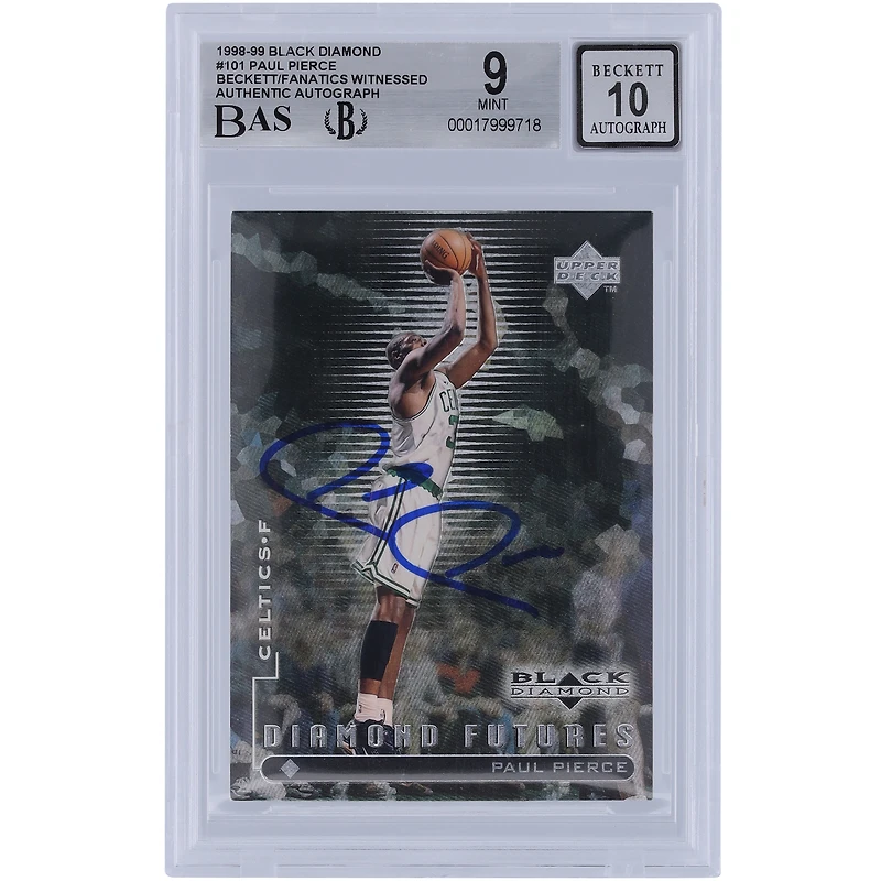 This Paul Pierce autographed 1998-99 Upper Deck Black Diamond #101 Beckett Fanatics Witnessed Authenticated 9/10 Rookie Card is ready to help you display your Boston Celtics fandom. Encapsulated in a tamper-proof acrylic case for preservation, this striking card also showcases the unique signature of Paul Pierce to make it the ultimate collector's item.