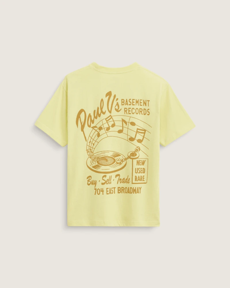 Honor Vans founder Paul Van Doren's legacy with this retro vinyl ad-inspired, easy-wearing short sleeve T-shirt. Breathable and comfortable, it features long-lasting screen printed artwork of a fictional record store under Paul's name, with the address for Vans' original warehouse location.
