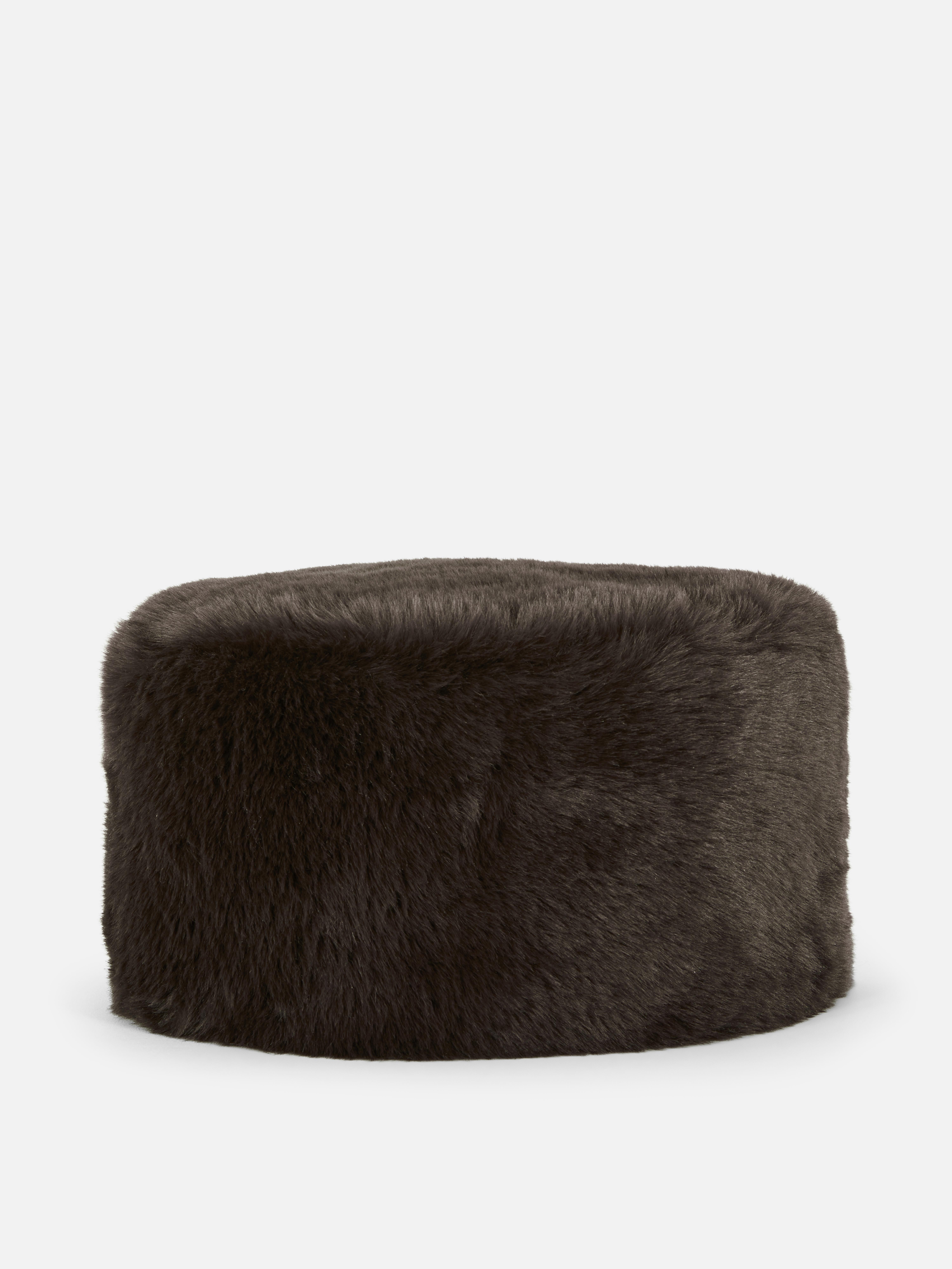 Faux fur pillbox hat in dark brown with structured, flat-top design