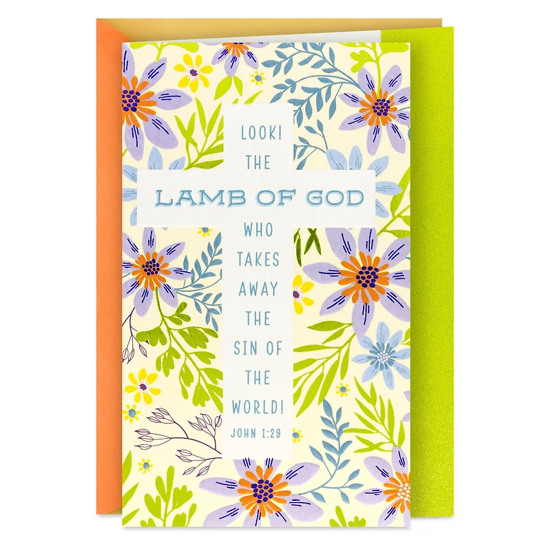 DaySpring Easter greeting card features an ivory cross with the words of a Bible verse from John surrounded by lovely flowers in purple, orange and green with embossing. A die-cut edge reveals a green textured-foil border, and a faith-filled message appears inside.