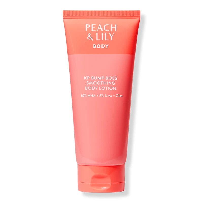 KP BUMP BOSS SMOOTHING BODY LOTION 6.0OZ. Benefits: Reveals skin that is smoother and less bumpy. Addresses strawberry skin or those pesky discolored or raised hair follicles. Brightens discolored skin on body and targets skin prone to ingrown hairs. 100% Worry-Free: Peach & Lilys expertly crafted formulas deliver powerful results made gentle for all, with products that embrace the highest beauty standards that are also fragrance-free, alcohol-free, gluten-free, and non-toxic.. Key Ingredients: 10% AHA (6% Lactic Acid + 4% Glycolic Acid): exfoliates, resurfaces and smooths. 5% Urea: deeply moisturizes, calms, and supports the skin barrier. Cica: reduces inflammation and redness. :
