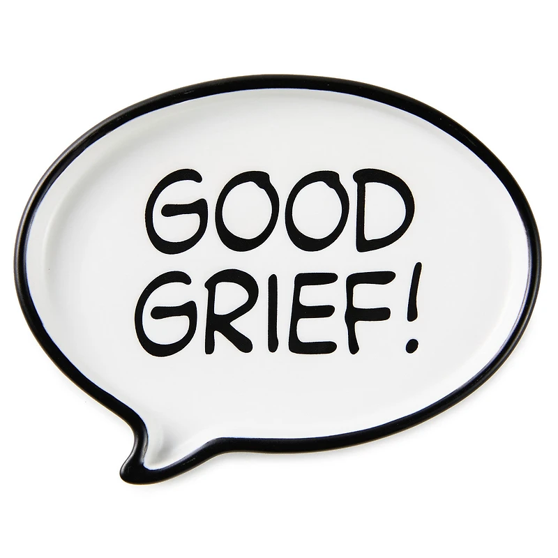 Keep your small treasures in classic Peanuts style with this unique trinket tray. Charlie Brown’s iconic “Good Grief!” catchphrase is centered in the base with black trim outlining the dish's speech bubble shape. The oval ceramic tray adds a playful touch to any desk, dresser, or entryway. Perfect for holding jewelry, keys, coins, or office essentials, it makes a functional and fun accessory for anyone who associates with good ol' Charlie Brown. Whether you're a longtime fan or just love a clever design, this tray makes a charming gift and a gives a nostalgic nod to the timeless humor and indomitable spirit of the Peanuts gang.
