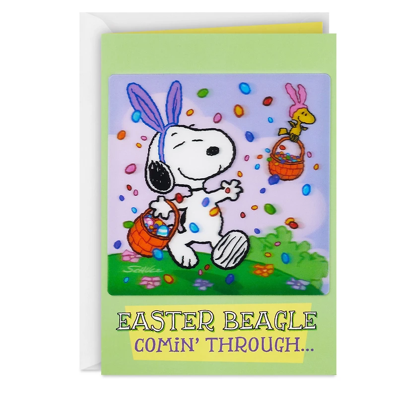 Peanuts Easter greeting card features Snoopy dressed up as the Easter Beagle with Woodstock distributing colorful easter eggs. The image's lenticular details add a fun motion effect to this cute card.