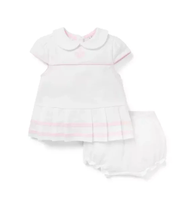 The perfect match for first moments. Our pique set is detailed with an embroidered Woodstock tennis icon, contrast piping and a pleated skirt. Plus, little puff sleeves and a Peter Pan collar. 100% Cotton Pique Short Sleeve Button Back Elasticized Waist Makes The Perfect Gift For Baby Machine Washable; Imported