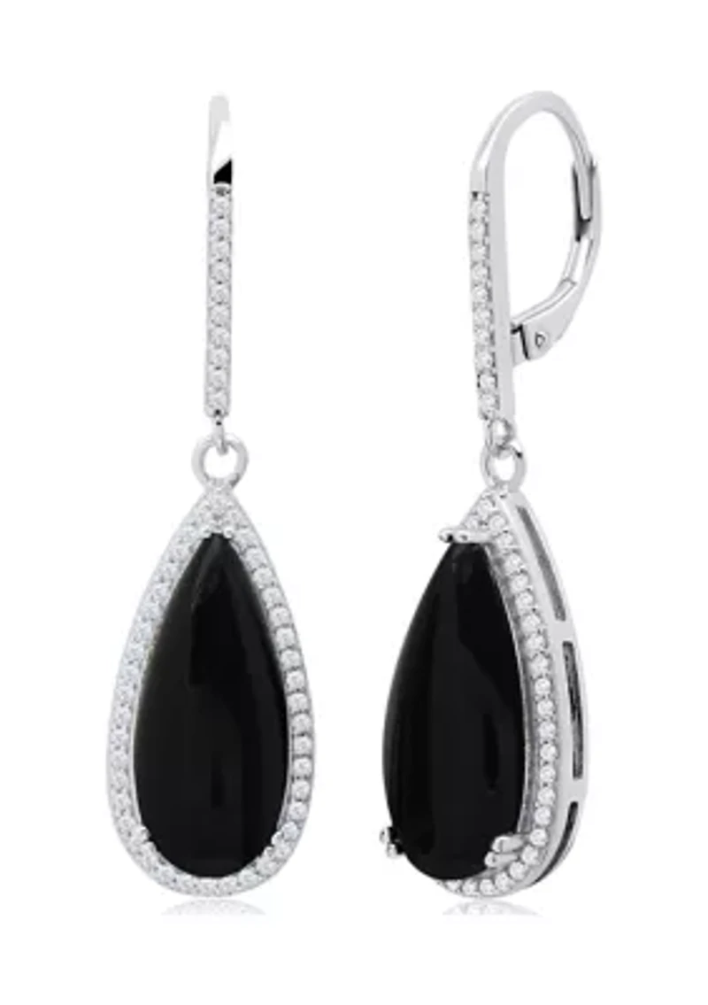 Pear Cut Onyx Quartz and White Topaz Halo Dangle Leverback Earrings in Sterling Silver (18x8mm)Pear Cut Onyx Quartz and White Topaz Halo Dangle Leverback Earrings in Sterling Silver (18x8mm)