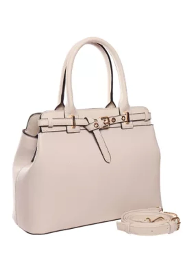 This Kim Rogers® satchel features a structured silhouette with a chic belted detail for timeless style. Designed with a 6" drop removable strap, it offers versatile carrying options for everyday use. 6" drop removable strap Imported Belk Exclusive Product Specifications 13" x 5" x 10" Material & Care Polyurethane Clean with a soft cloth