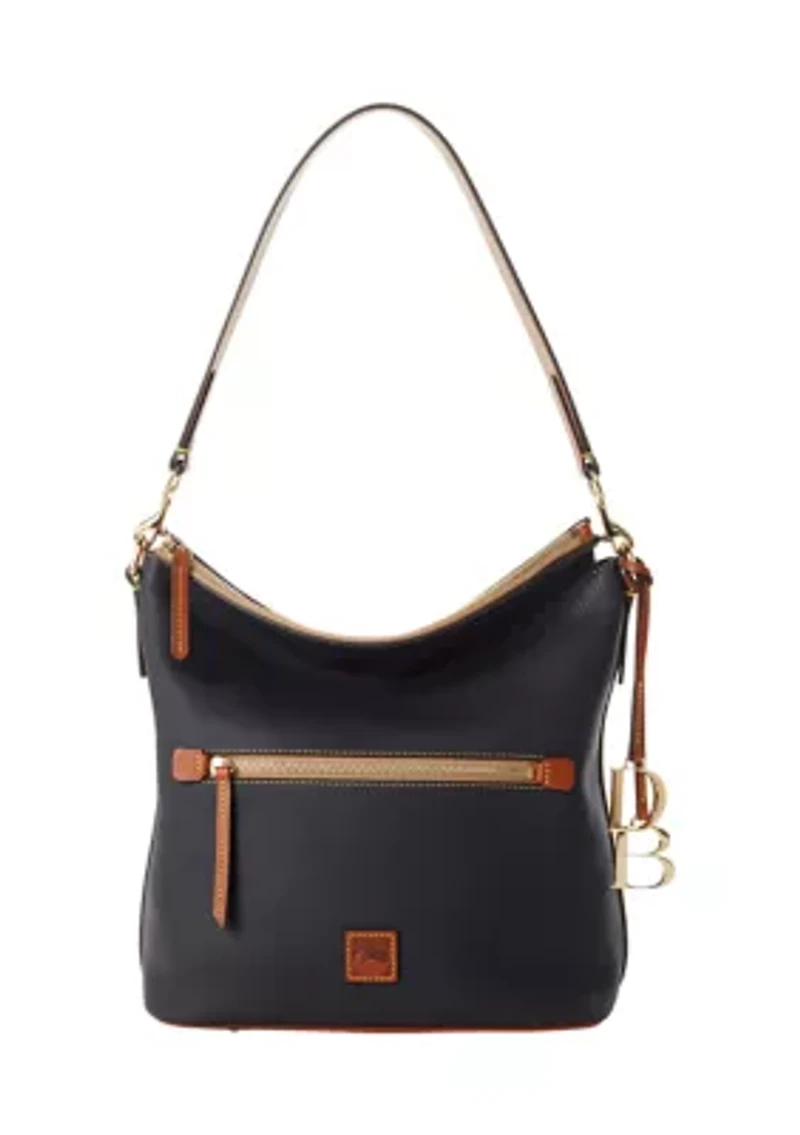 Crafted from Dooney & Bourke's all-new European pebble grain leather known for its iconic texture, now with a more lightweight and irresistibly buttery feel. The largest of their hobo silhouettes, this roomy sac is comfortable to carry thanks to wide leather straps. Zip closure Shoulder strap with 13" drop Exterior: 1 outside zip pocket Interior: 1 zip pocket, 2 pockets, cell phone pocket, key hook, lined Imported Product Specifications 11" x 6.25" x 9.5" Material & Care Leather trim Leather Clean with a soft cloth