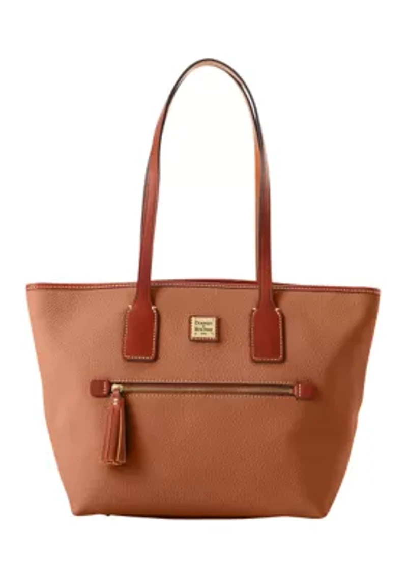 Designed in textured pebble leather, this small tote from Dooney & Bourke is a stylish everyday accessory. Zip closure Shoulder strap Interior: 1 inside zip pocket, 3 inside pockets, key hook, lined Imported Product Specifications 9.75" H x 6" W x 10" L Material & Care Leather trim Leather Clean with a soft cloth