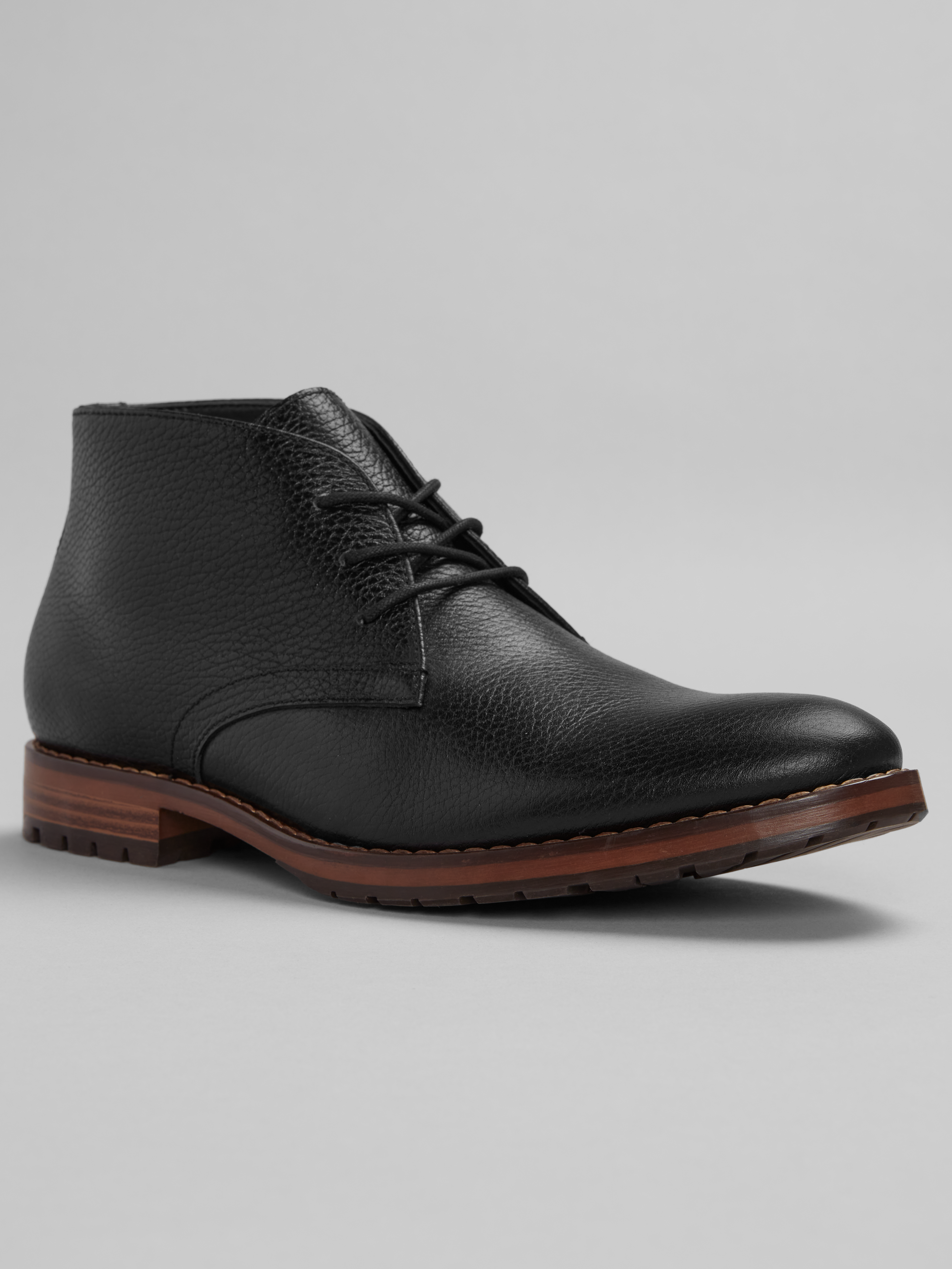 These Joseph Abboud leather chukkas bring understated style to everyday dressing. Crafted with a subtle pebbled texture, they offer visual depth while maintaining a refined, polished look. The classic lace-up design and cushioned sole provide comfort and versatility making them an easy match with everything from denim to tailored trousers.