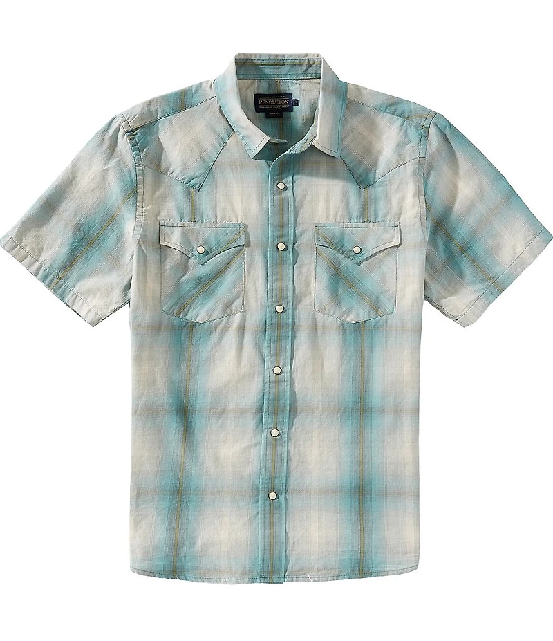 From Pendleton, this shirt features: Mixture of plaid pattern and ombre detail Spread collar Peaked yokes Short sleeves Snap-front closure Dual chest pockets Shirttail hem Cotton Machine wash/tumble dry Imported.