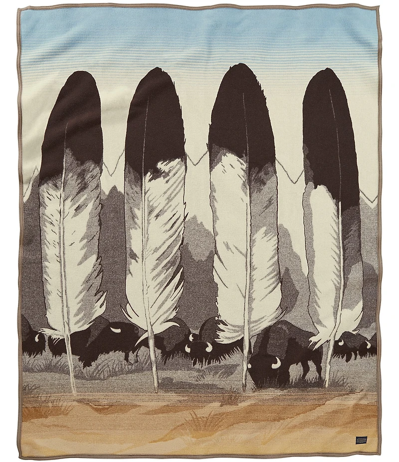 From Pendleton Woolen Mills, the In Their Element Jacquard Robe Throw Blanket features: Known for over a century of textile excellence, Pendleton blankets combine heritage design, durable materials, and exceptional comfort—making them a staple for cozy homes, cabins, and outdoor adventures. Eagle feathers and bison are sacred symbols in Native American culture. Navajo artist Joe Toledo uses these symbols in his painting, “In Their Element,” representing three elements; Earth, Air and Water. A herd of bison graze on the Earth, offering prosperity and protection. A range of mountains towers above the herd, their snowy peaks covered with life-giving Water. Standing Eagle feathers rise into the sky, joining together Earth, Water and Air, and carrying Eagle’s spirit to a place of strength above the clouds. 82% virgin wool /18% cotton Napped; fabric is combed for a softer, thicker feel Fabric woven in our American mills Premium wool blanket inspired by a painting by Navajo artist Joe Toledo Comes with a Legendary Collection label Felt bound Approx. 64" x 80" Dry clean Made in the USA.