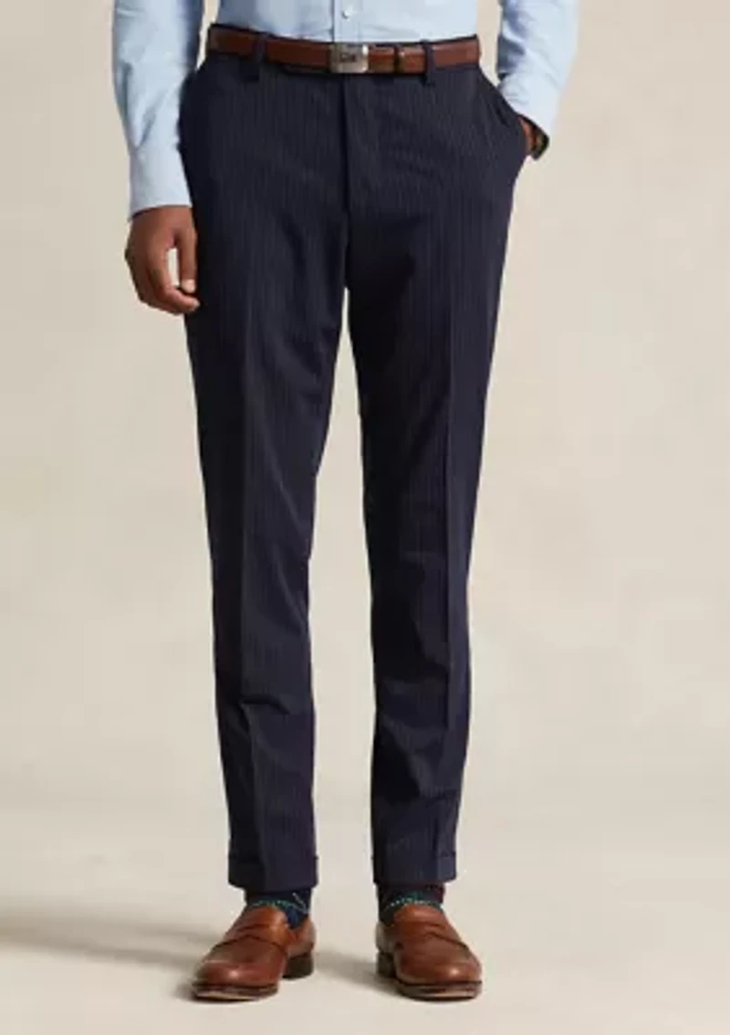These flat-front trousers are tailored with a new Polo Ralph Lauren-exclusive twill cloth that is custom-developed for natural wrinkle resistance and a smooth, shine-free finish. Added stretch provides extra comfort and mobility, making this lightweight trouser perfect for all-season, everyday wear. Size 33W trouser has a 9" rise and a 14.75" leg opening Belt loops Zip fly with an extended hook-and-bar closure Curtain waistband Two front-angled pockets Coin pocket at the right hip Two back buttoned pockets Cuffed hems Lined to the knees at the front Cuffed hems Lined to the knees at the front Model is 6'1" (185 cm) and wears a size 32W x 32L Imported Material & Care Polyester, cotton, elastane, viscose, wool Dry clean only