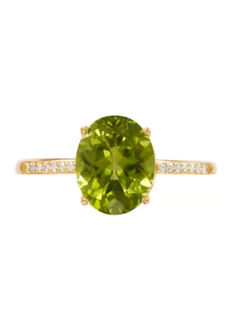 Indulge in the captivating beauty of this oval-cut Peridot ring from Belk & Co.. Set in lustrous 10K yellow gold, the vibrant green Peridot is adorned with sparkling diamonds. Its polished finish exudes elegance, making it a timeless treasure for any jewelry collection. 1 Peridot, 14 Diamonds Slip-on Color rating: I Clarity rating: I3 Polished finish Prong setting Imported Belk Exclusive Product Specifications 0.39" H 1/20 ct. t.w. Diamond Material & Care 10K Yellow Gold Clean with a soft cloth