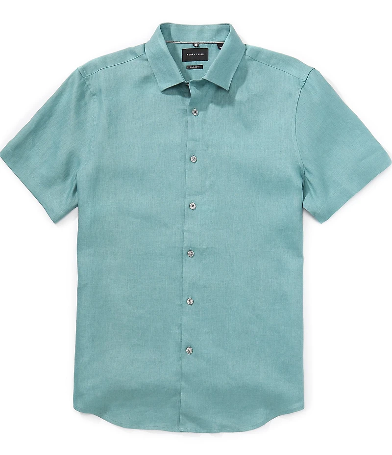 From Perry Ellis, this shirt features: Allover solid tone Spread collar Short sleeves Button-front closure Linen Machine wash/tumble dry Imported.