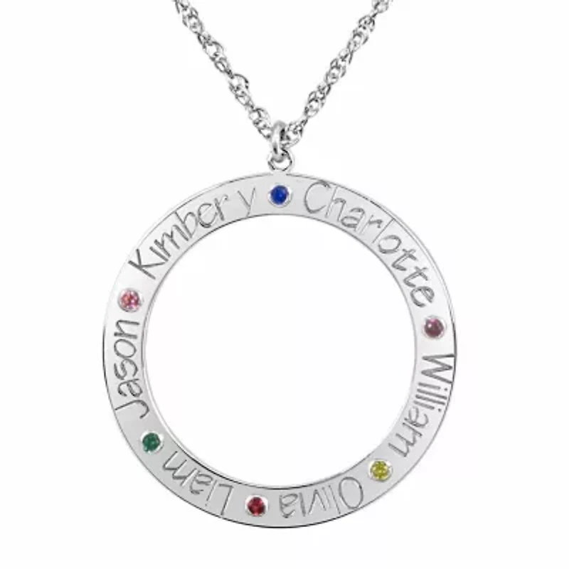 This personalized family pendant necklace is a sentimental, stylish jewelry piece you'll love wearing. Made from Sterling Silver, it features a round cut-out pendant necklace inscribed with every family member name and birthstone.