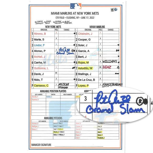 Pete Alonso New York Mets Autographed Game-Used Lineup Card vs. Miami Marlins on June 17, 2022 with "Grand Slam" Inscription