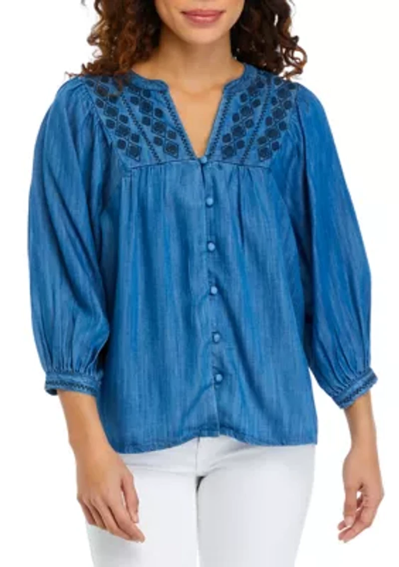 Petite Embroidered Yoke Button Down Top