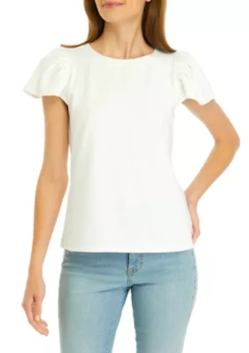 Frilly flutter sleeves add charm to this simplistic t-shirt from Crown & Ivy™. Pullover Crew neck Short flutter sleeves Unlined Imported Belk Exclusive Product Specifications 22" L Material & Care Cotton, polyester, spandex Machine washable