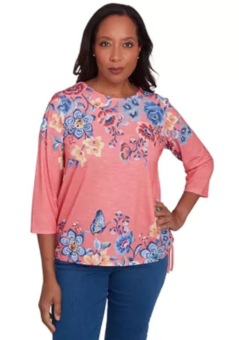 Make a statement with this stunning floral-printed top from Alfred Dunner. The bold and eye-catching design adds a touch of drama to any outfit. The 3/4 sleeves and crew neckline provide a classic silhouette, while the ruched side adds a touch of texture and interest. Pullover Crew neck 3/4 sleeves Unlined Imported Product Specifications 22.5'' L Material & Care Polyester, spandex Machine washable