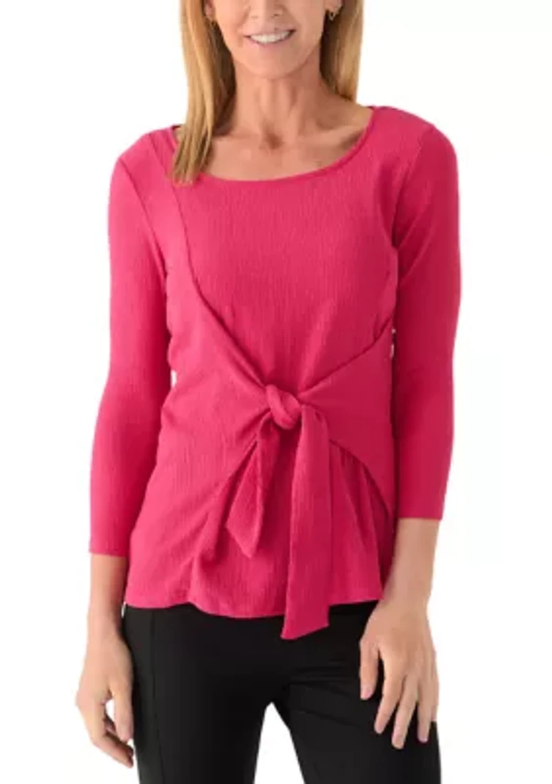 This Vince Camuto knit top features a stylish knot-front detail that creates a flattering, modern silhouette. Crafted from soft, comfortable fabric, it offers an easy fit that’s perfect for everyday wear. Pullover Crew neck Long sleeves Imported Product Specifications 25" L Material & Care Polyester, spandex Machine washable