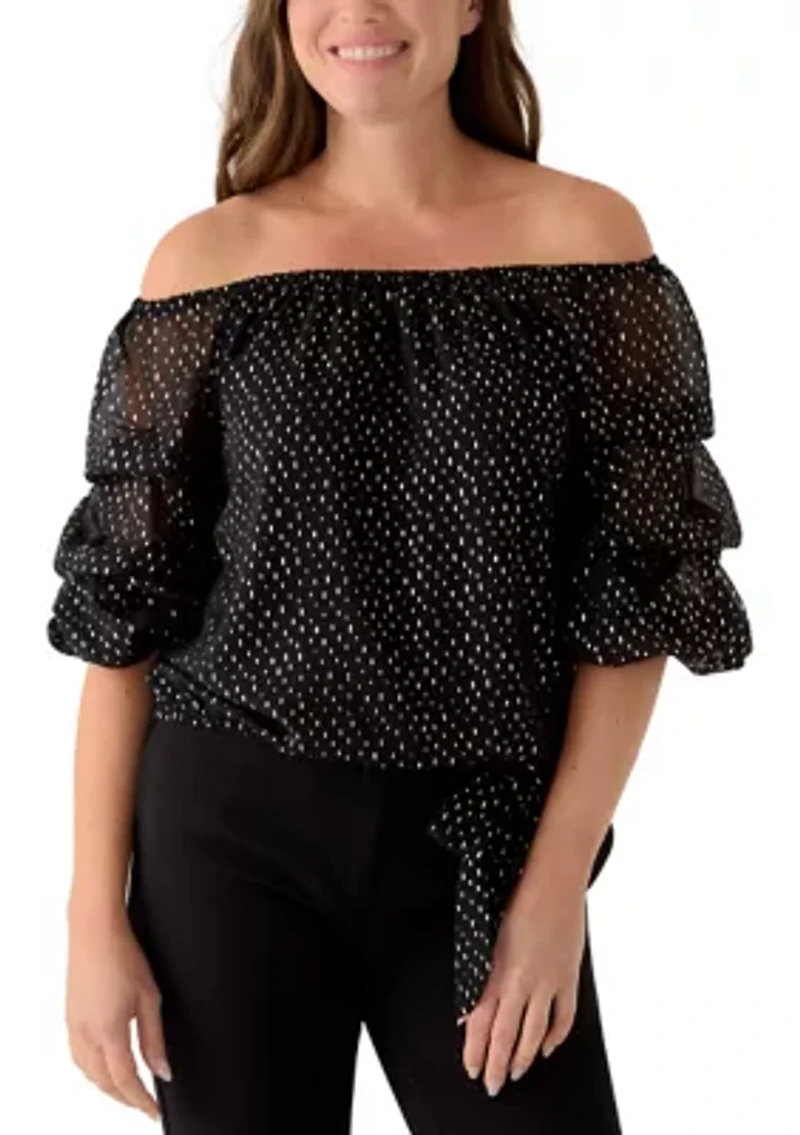 Easy to wear and with a rich black color and subtle dots, this elegant top from Vince Camuto is perfect for any occasion. Pullover Off-the-shoulder neck Three-quarter blouson sleeves Fully lined Imported Product Specifications 20" L Material & Care 100% polyester Hand wash