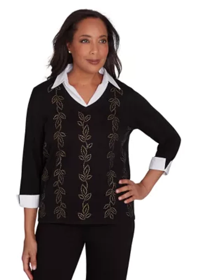 Alfred Dunner Petite Lake Champlain Leaf Embroidered Rib Neck Top