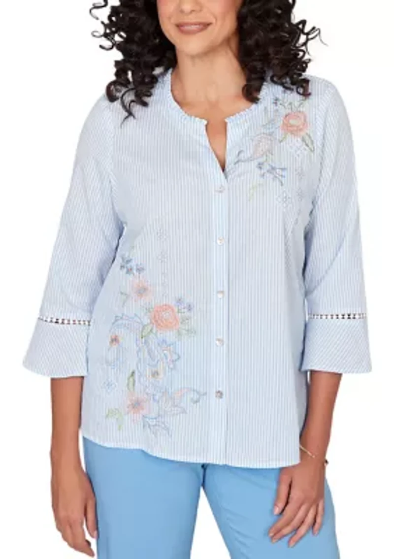 Soft stripes set the stage for delicate floral embroidery that blooms across this Alfred Dunner button-down top. The split neckline and button front add classic structure, while three-quarter sleeves are finished with printed cuffs for a charming touch. A straight hemline completes the look, blending tailored polish with feminine detail. Button closure Split neck 3/4 sleeves Unlined Imported Product Specifications 23" L Material & Care Cotton Machine washable