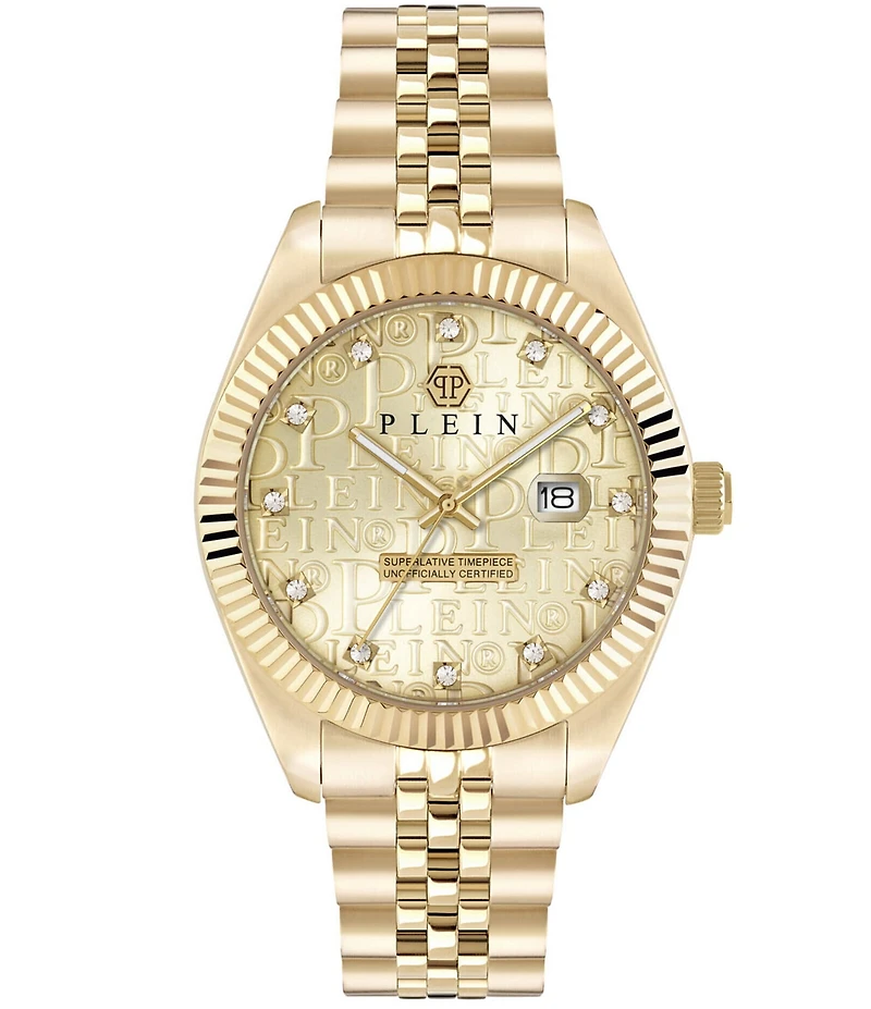 From Philipp Plein, the Men's Date Superlative Mechanical Automatic Two Tone Stainless Steel Bracelet Watch features: Two tone stainless steel bracelet and case Guilloche dial Link / clasp closure Mechanical automatic movement Case size approx. 41mm Imported.