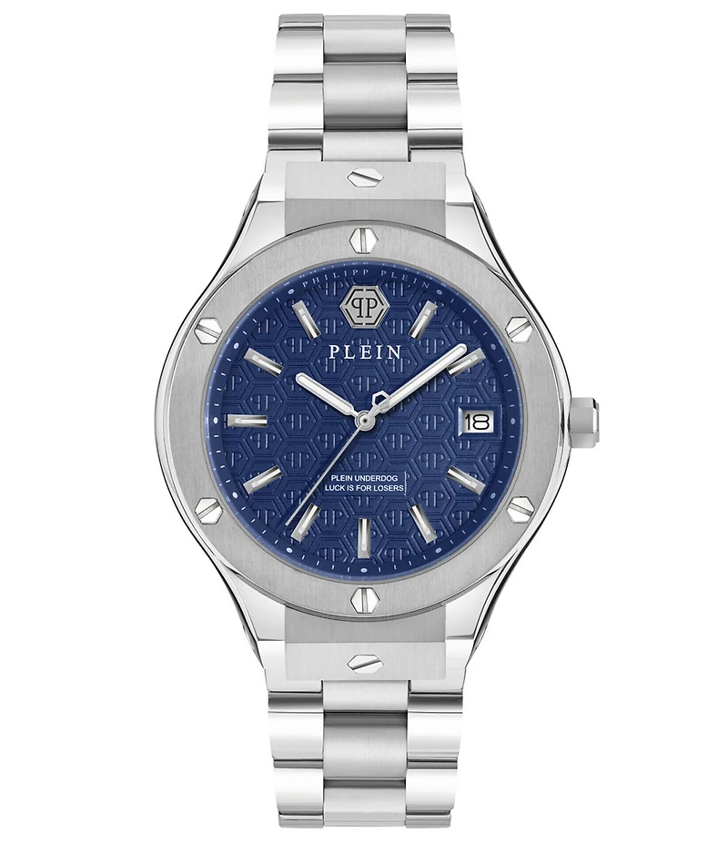 From Philipp Plein, the Men's Plein Underdog Mechanical Automatic Stainless Steel Bracelet Watch features: Stainless steel bracelet and case Blue guilloche dial Link/clasp closure Mechanical automatic movement Case size approx. 44mm Imported.