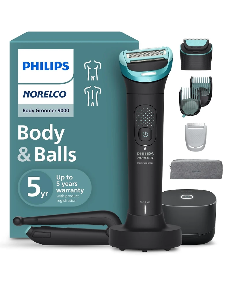 Philips Norelco Body Groomer 9000 Series, Body Hair Trimmer for Men and Intimate Shaver System with Uv Cube Cleaner and Adjustable Back Attachment, 100% Showerproof.