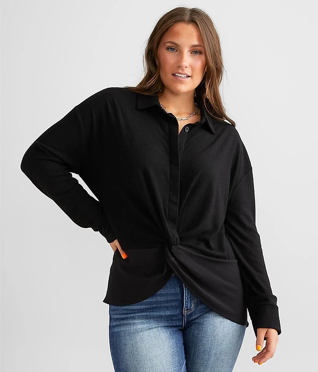Petite Three-Quarter Sleeve Pleat Knit Blouse