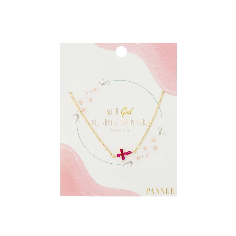 Simple, elegant, and full of meaning—this Pannee necklace features a sparkling pink crystal cross pendant on a dainty gold chain. Displayed on an inspirational card with “With God All Things Are Possible,” it makes a thoughtful gift of encouragement or faith. Details:• Dainty gold-tone chain necklace• Pink crystal cros