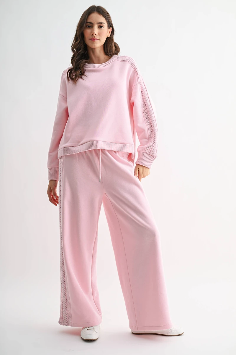Intricate cable knit trim runs down outer sleeves and pant legs for a textured, elevated touch