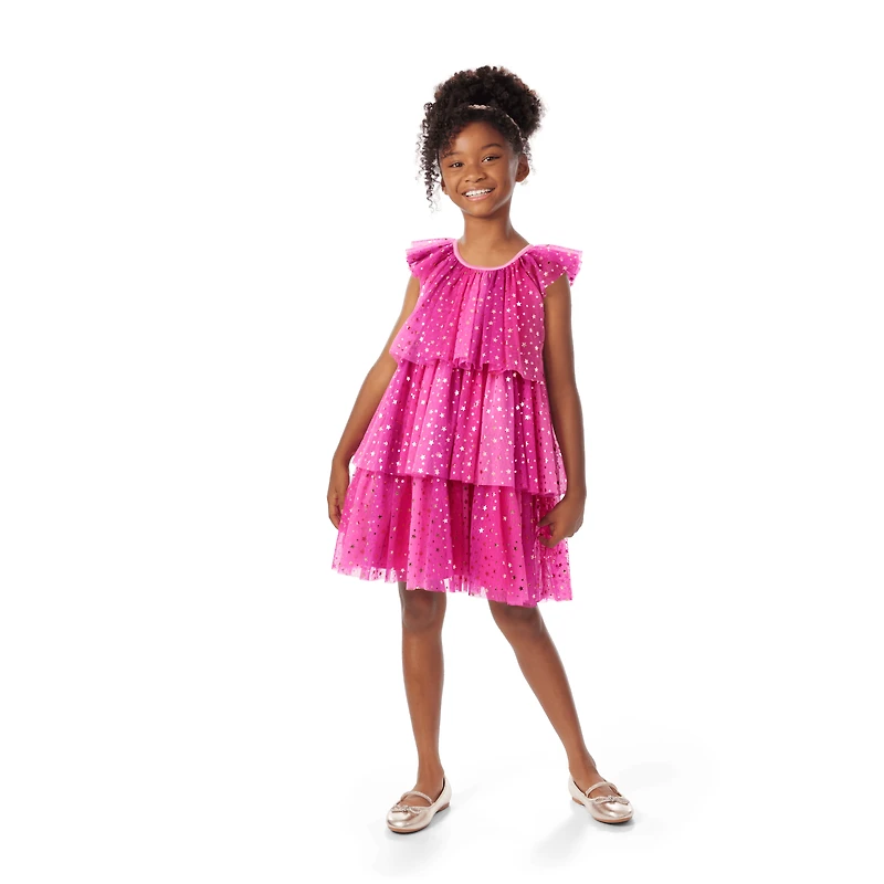 A twirly trapeze-style dress for girls featuring three tiers of ombre-pink mesh, flutter sleeves, and allover golden foil-print stars.