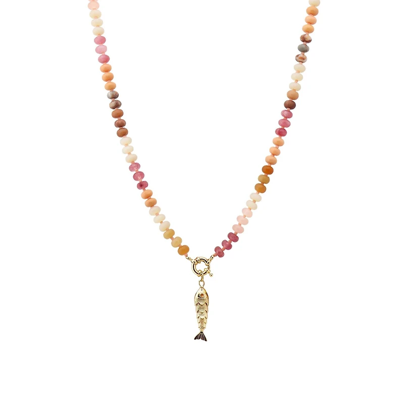 Shop this pink multi-beaded necklace featuring blush, peach, and neutral tones with a gold fish charm for a playful, coastal-inspired statement look.
