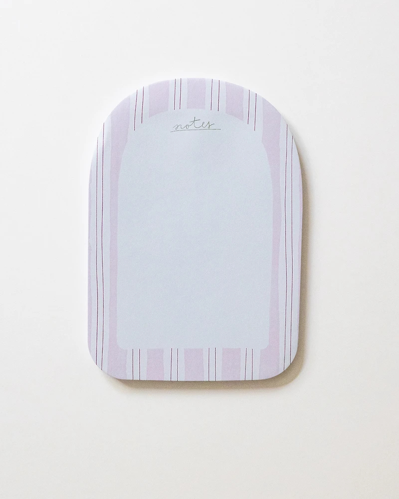 Be inspired by this cute trendy notepad! With pink, maroon, and off-white stripes, it's perfect for jotting down notes and ideas. Its unique shape and sticky adhesive make it a convenient and charming addition to your workspace. Get organized in style with this must-have notepad!