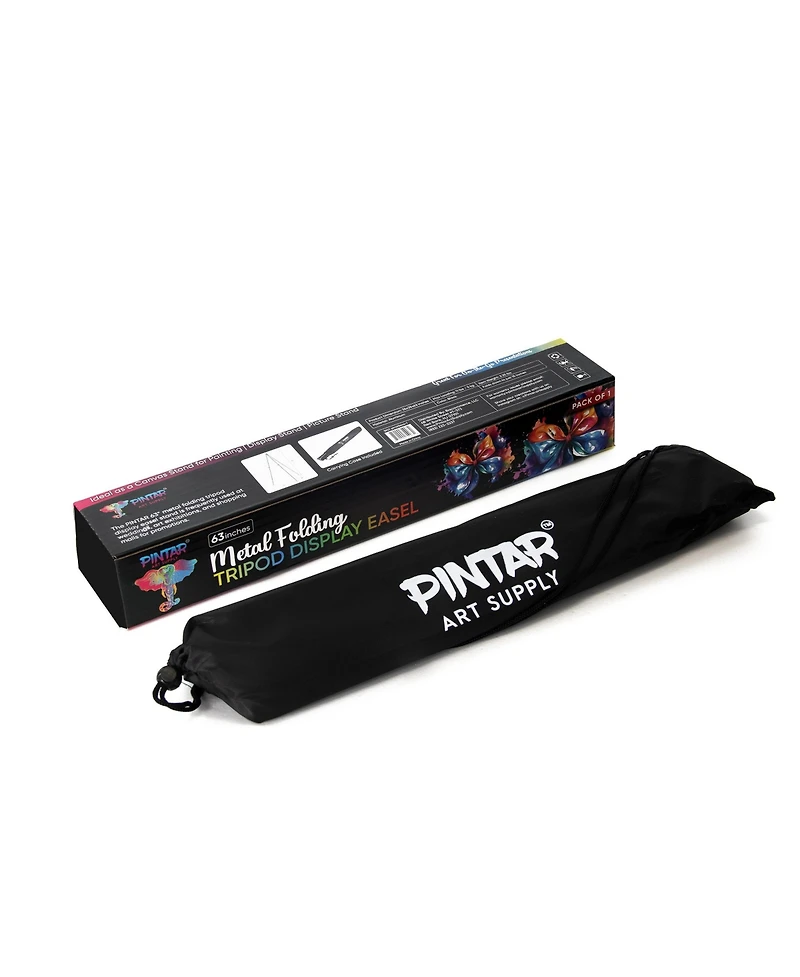 Showcase Your Work with the Pintar Easel Stand - The Ultimate Display Solution!The Pintar Easel Stand is the perfect way to display your art, posters, and signs with style and stability. Designed for versatility and portability, this 63-inch metal tripod easel is perfect for artists, event planners, and presenters alike. Whether you're displaying artwork at an exhibition or promoting a product at a wedding, this easel takes your display to the next level.Stable and Adjustable for Any DisplayWith adjustable support arms and a sturdy rear leg, the Pintar Easel Stand accommodates canvases, boards, and posters of all sizes. Whether you're painting or presenting, you can easily adjust for the perfect angle and positioning, giving your display a polished, professional look.