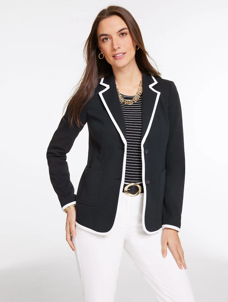 A forever classic. Accent your outfits this season with our beautifully tailored blazer. Cut from relaxed cotton-piqué in a feminine silhouette with easy button front closures. The perfect addition to your polished work to weekend wardrobe. Hits at the hip.